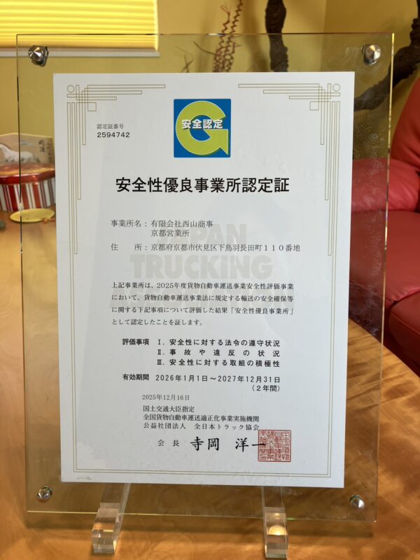 弊社は、ドライバーの皆さんが長く安心して働ける環境づくりに力を入れています。その証として、国土交通省が推進する厳しい安全基準を満たした事業所に与えられる「安全性優良事業所(Gマーク)」を取得しています。